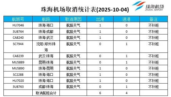 受台风影响,10月4日,珠海机场取消出港航班6班,进港航班4班,详见下图: